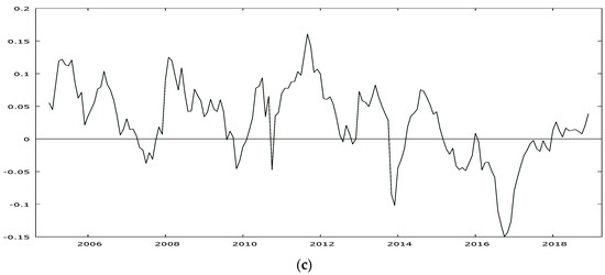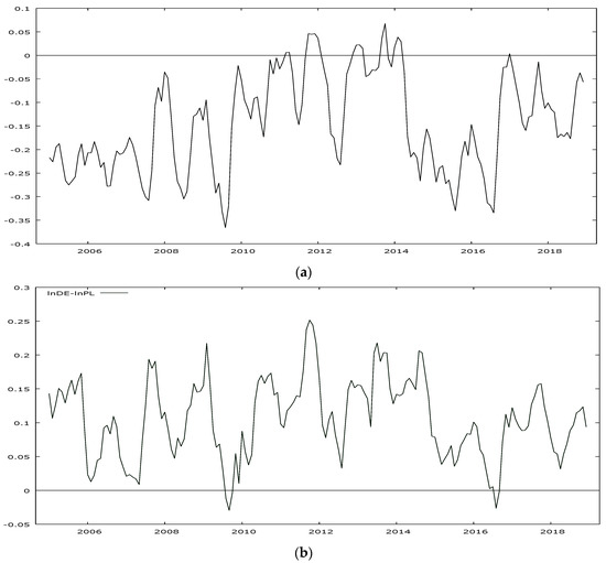 A more thorough understanding of the price differences requires presenting the typical cases which can occur on the market. The first one is when the prices in Poland are higher than in other countries, which is the case only between Poland and Lithuania (Figure 4a). In the second case, the differences in prices oscillate around zero, which was recorded for the Czech Republic, Slovakia (Figure 4b), Estonia, Latvia and Hungary, which is the countries which joined the EU the same year as Poland. The similarity in the price variation depending on the time of joining the EU has been stressed by, e.g., Bakucs et al. [30]. Besides, one must note that the group includes all the EU countries found in a close vicinity of Poland, which can be due the fact that milk is indeed a perishable product and, as such, it shows limited transport possibilities. In the third case, the prices in Poland are lower than in other countries. It is the case for the other countries, including the ones provided in 4c (Germany).