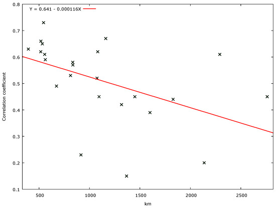 The Spearman’s rank coefficients of correlation between time series (logarithms and the first logarithmic increments) were calculated (Table 4). The coefficients of correlation for the price logarithms for the entire period ranged from 0.42 to 0.92, and for the first increments—from 0.20 to 0.73. The lowest values of the coefficient of correlation between the Polish milk prices were noted for the prices in Finland and in Cyprus. The highest values of the coefficient of correlation were reported for Germany, the Czech Republic and Slovakia. As for the comparison of the two sub-periods, one must note that the mean values of the coefficient of correlation for all the countries for the analysis of the first differences increased slightly from 0.49 to 0.59. However, as for the countries with the highest coefficient values, one must observe the maintained tendency in both periods for Germany, Hungary, Slovakia, and then for the Czech Republic, Belgium, and in the second period—also for Lithuania and Latvia. The analyses facilitate formulating the conclusion that the closer the countries are located, the higher the covariance of prices (Figure 5). A similar conclusion about the role of distance can be found in other publications [3,30].