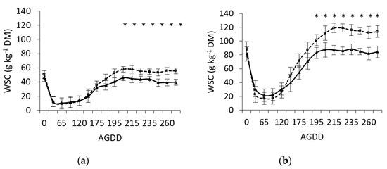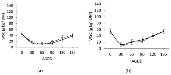 It was observed that in both L. perenne and B. valdivianus, the concentration of WSCs in the blades and sheaths significantly decreased following defoliation until 30 AGDDs (p < 0.05, Figure 2 and Figure 3), (a) and (b) when plants began to accumulate WSCs. This process was similar for both blades and sheaths.