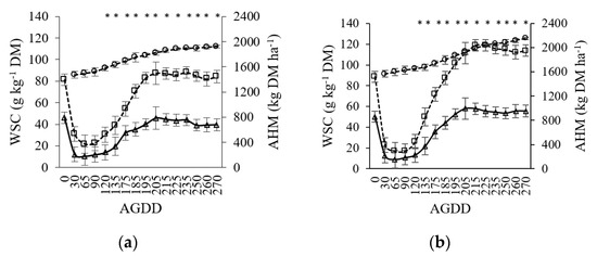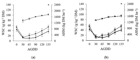 The higher AHM with defoliation every 270 AGDDs compared to 135 AGDDs demonstrates that there is a relationship with WSC recovery, given that higher WSC concentrations were measured with higher AHM (20% and 27% more than 135 AGDDs, respectively). This is supported by both Donaghy and Fulkerson [5] and Lee et al. [38], who reported that there is a positive linear relationship between these variables (r2 = 0.52, leaf blade (g kg−1 DM) = 1.04 + 0.99 WSCs). This behavior is replicated in the majority of forage species, corroborating the close relationship between WSC concentration and AHM [39,40].