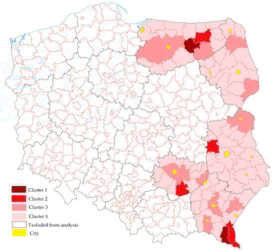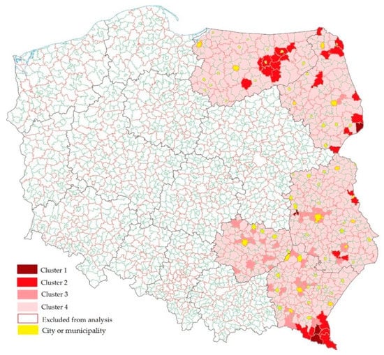 A further step involved the analysis of tourism competitiveness of the regions based on the economic-enterprises-related data. For this purpose, the variables NEEA, NEER, and EETN were applied. In addition, due to data availability, the analysis was performed at a more detailed level, at the level of communes, which facilitated providing more accurate results. The study was carried out for the rural communes and urban-rural communes, excluding the municipalities. The results of commune grouping with the use of cluster analysis are presented in Figure 2.