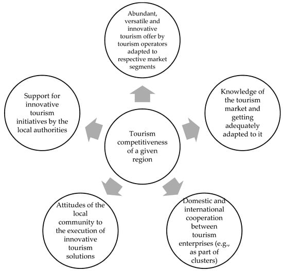 In the areas with lesser natural qualities, to get the tourists interested in a given region, one can compete with an innovative offer for tourists [55]. Such an offer can be proposed by, e.g., tourism organizations (creating a tourism product), the local authorities at the commune level, and tourist facilities (guest houses, agritourism farms) [56]. There is a high competitiveness among the agritourism farms [57]. In the area under study, there are conditions favorable to the development of innovative tourism-related forms [58]. Enhancing the competitiveness of the region through the innovativeness of such offers results from many factors, as presented in Figure 3.