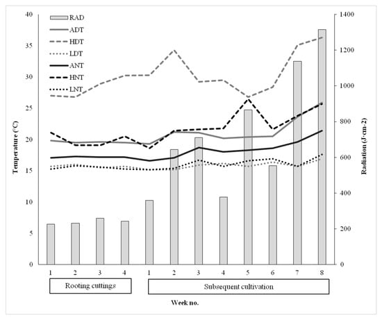 Weekly radiation (RAD) as well as weekly average day temperature (ADT), highest day temperature (HDT), lowest day temperature (LDT), average night temperature (ANT), highest night temperature (HNT), lowest night temperature (LNT) during the experiment.