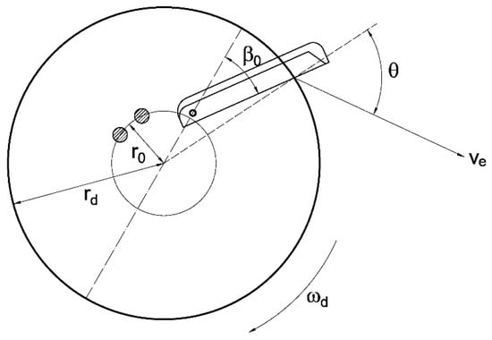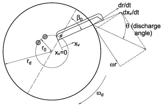 The considered disc fertilizer spreader consists of a single rotating disc having two straight vanes mounted on it. A hopper having a dosing outlet and a stirrer feeds the disc with the fertilizer. Usually, the fertilizer is thrown away from the disc-vanes device with a speed ve that ranges between 15–50 m·s−1 with a maximum value that, in some case, can reach 70 m·s−1 with higher speeds related to wider working widths [25]. The fertilizer particle eject speed is directly related (Figure 1) to the angular speed of the disc ωd and to specific design factors of the spreader itself such as: (i) the disc radius rd; (ii) the fertilizer feed point radius r0; (iii) the angle between each vane and the corresponding radius (pitch angle β0) and (iv) the cone angle of the rotating disc.