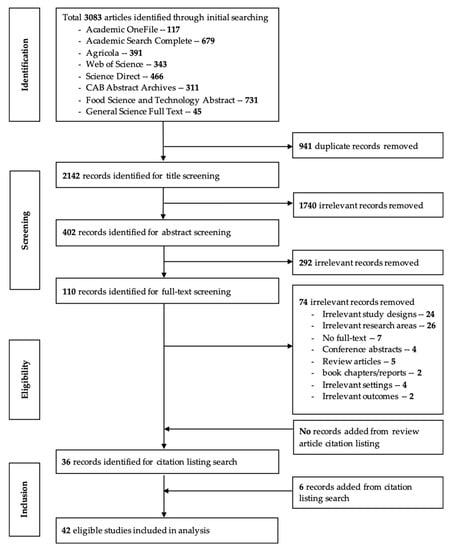 The initial search for relevant articles yielded 3083 articles. After removal of duplicates, 2142 articles were identified for possible inclusion in the sample by title and abstract screening. From title and abstract screening, 1740 and 292 irrelevant articles were excluded, respectively. The full texts of the 110 remaining articles were reviewed, and 74 irrelevant articles were removed based on our eligibility criteria—irrelevant study design (n = 24), irrelevant research area (n = 26), no full text (n = 7), conference abstracts (n = 4), review articles (n = 5), book chapters/reports (n = 2), irrelevant settings (n = 4), and irrelevant outcomes (n = 2). The citation listings of the five review articles were hand searched, and no additional articles were added. The citation listings of the 36 full-text articles were hand searched, resulting in six additional articles. A total of 42 articles were included in our study sample (Figure 1). Of the 42 studies, six studies were outbreak investigation studies [,,,,,]. Those studies were not included in quality assessment or analysis of study findings. Therefore, a total of 36 studies were used for the final analysis.