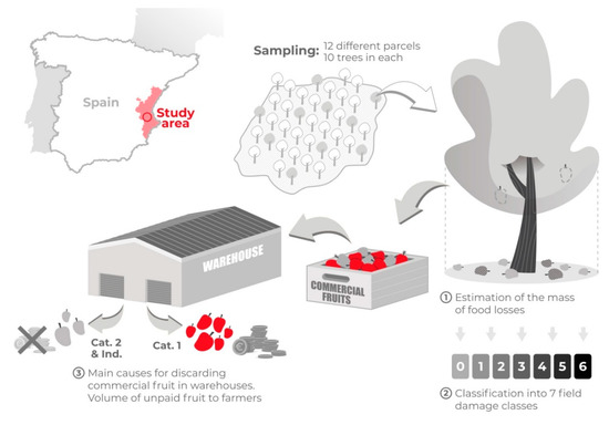 The main objectives of the present study are to generate knowledge on the FL volume in the first chain phases (harvest and storage). For this purpose, primary data obtained through on-site measurements are provided for persimmon trees located in the Spanish Mediterranean area. Thus, in contrast to already existing studies which focus on vegetable crops, the present study focuses on the unique area of tree fruit crops. The causes of losses are identified and the potentials for prevention are analysed. This work also seeks to estimate the additional fractions unpaid to producers, which is the case of the FL occurring in the storage phase. The estimation of total losses and unpaid fruit using, in this case, persimmons could help us to understand the current situation that producers face. The intention is to take advantage of already available approaches adapted for additional types of crops, allowing comparisons to be made and synergies to be generated among different FL studies. Adding experiences is a key aspect to facilitate future comparable data sets on FL in the earliest stages. Furthermore, this approach was carried out in line with the previously made initial attempts [19,20] to also complement the conclusions reached by those authors.