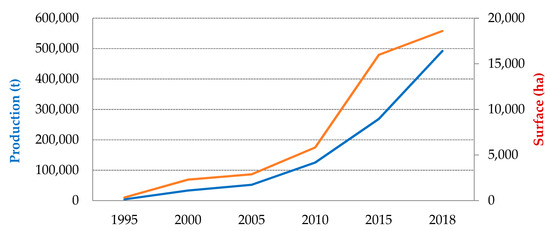 Although the persimmon crop has been a minority crop over the years, many plantations with a commercial orientation have appeared in the last few decades in the Valencia region. Evidence for this importance lies in the persimmon area having increased in general in Spain, and in the Valencia region in particular, especially in the last two decades (Figure 2). There are several reasons for this increase. The first one is related to the palpable lack of citrus fruit profitability in recent decades, which forces alternatives to be found [28,29,30]. The second is the agro-climate requirements for persimmon crops and the fact that agricultural holdings are managed similarly to those of orange or mandarin, which are the most extended fruit plantations in the Valencia region.