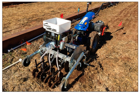 Because of weight restriction, the planter’s enhanced design is required to successfully plant seeds into soil with residue cover using small low-power walk-behind tractors. These tractors must provide power (through the PTO shaft) to rotate cutting units (coulters) at RPMs higher than through rotation provided by friction to cut the residue and make a notch for appropriate depth seed placement. This solution allowed soil penetration due to rotating (higher RPM) coulters at the desired depth compensating for the low weight of the planter (120 kg); 40 kg per one planting unit [14]. The primary components of the no-till planter were three active 0.38 m diameter coulters (active: means powered from the tractor’s PTO (Figure 2). In this planting system, the tractor’s PTO connection rotates at approximately 940 RPM is connected to a reduction 90-degree gearbox with 2:1 ratio. From there, the gearbox outputs at a speed of 470 RPM that is coupled to a chain drive (1.3:1 ratio) providing power to a keyed shaft on which the individual coulters are mounted with a final rotational speed of 360 RPM. The seed hopper capacity was 0.021 m3. Metering units placed at the hopper’s bottom are operating independently from the powered coulter and tractor operating speed, utilizing the 12-volt electric motor with a built-in reduction gear box from the commercially available vendor GANDYTM. Therefore, constant operating must be maintained to obtain a constant seeding rate on which the machine was calibrated. Seed falls through a flexible tube connected to the metering unit each with a set double disk opener for seed placement at the desired depth. Behind the disk openers there are the closing press wheels to close the grooves and to make sufficient seed to soil contact. A spring-loaded parallel linkage system provides flotation and downforce to each independent row unit.