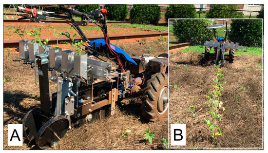 (A) no-till transplanter weighting 125 kg for the walk behind tractor [16]. US patent number: US 10,004,174 B2). (B) Transplanted tomatoes into rolled and crimped cereal rye residue cover.