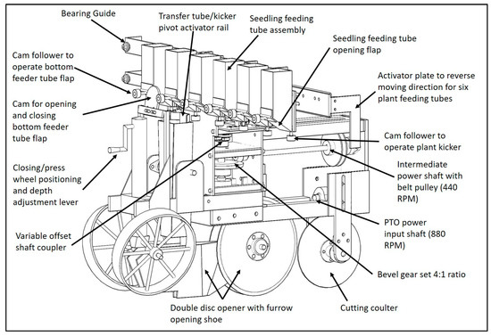 Larger commercial transplanters must be operated by at least two people; one to ride the transplanter and one person to drive the tractor. In contrast, this system is operated by one person who simultaneously operates the walk-behind tractor (Figure 4). The transplanter comprises six vertical assemblies of rectangular tubes for seedlings, which are continuously moving from left to the right transversely to the driving direction. The main assemblies and mechanisms of the no-till transplanter are depicted in Figure 5.