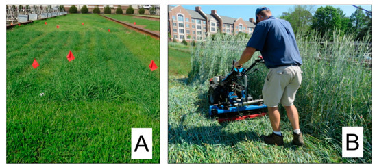 Cereal rye planting emergence as depicted in Figure 6A, showed a uniform greenness without skips indicating that powered coulter drill planted cereal rye seeds uniformly. Moreover, the number of emerged plants per 1.0 m2 area indicate that the active coulter no-till drill performed as well as standard heavy no-till drills. In 2017, rye biomass production on Davidson clay was 9.8 Mg ha−1, with plant height of 159 cm, whereas on sandy loam rye biomass was significantly lower generating 4.9 Mg ha−1 and plant height 149 cm which is a typical rye biomass generated by commercial heavy no-till drills. In 2018 rye biomass production was similar on both soils generating 11.4 mg ha−1 (162 cm height) on Davidson clay and 11.2 Mg ha−1 (156 cm height) on Hiwassee sandy loam. In 2019 growing season, rye biomass was higher on Davidson clay producing 9.4 Mg ha−1 (height 166 cm) compared to 5.9 Mg ha−1 with plant height of 168 cm on sandy loam. Main reason for differences in biomass production was for the clay soil availability to hold nutrients and water better during the rye growing season compared to sandy loam, where more infiltration might cause leaching of nutrients.