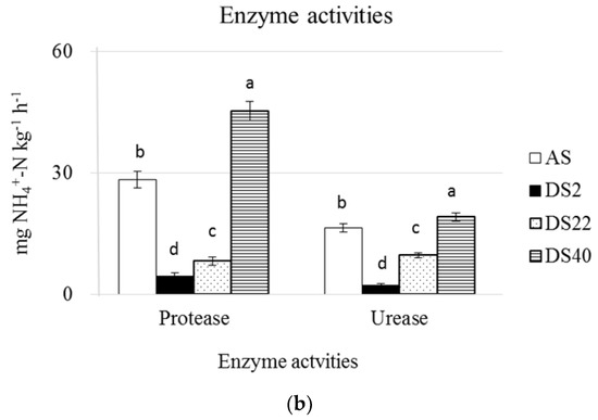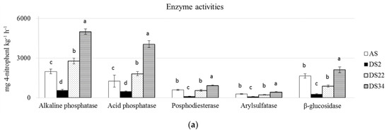 The DS34 and the DS2 soils showed the highest and the lowest values for all the measured enzyme activities, respectively (Figure 1). For the other two analyzed soils, the DS20 showed higher values of the alkaline and acid phosphatase activities than the AS soil, while the AS soil showed higher protease, urease and β-glucosidase activities than the DS20 soil, and the phosphodiesterase and arylsulfatase activities showed similar values in the two soils (Figure 2).