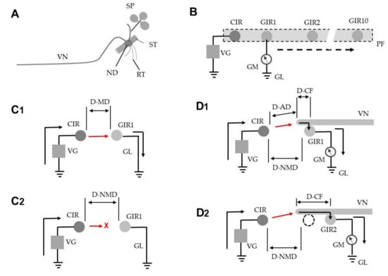 (A) Vine development from the node of a stem cut from a kudzu plant. (B) Structure of the ladder-shaped exposer of the pulsed arc discharge (LE-PAD, cross-sectional view). Determination of the arc discharge distance required to cause mechanical discharge (C1) and the non-mechanical discharge-causing distance (C2) between the charged iron rod (CIR) and Grounded iron rod (GIR1). Exposure of a vine in contact with GIR1 (D1) and GIR2 (D2) to the arc discharge. The solid arrow represents the direction of electricity movement with the arc discharge (red arrow), and the dotted arrow shows the change in the GIRs connected to the grounded line. Abbreviations: VN, vine (runner). ND, node. SP, sapling. RT, root. ST, stem cutting. VG, voltage generator. CIR, negatively charged iron rod. GIR1–GIR10, grounded iron rods 1–10. GL, grounded line. PF, polypropylene frame. GM, galvanometer. D-MD, distance to cause mechanical discharge. D-NMD, distance to cause no mechanical discharge. D-AD, distance to cause arc discharge. D-CF, distance of current flow on the vine.