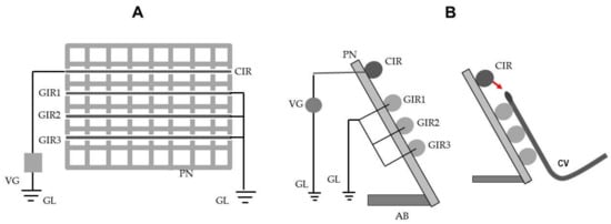 Based on the results obtained in the present study, we constructed a simple version (SE-PAD) of the LE-PAD (Figure 2), where one CIR and three GIRs were paralleled at an interval of 10 cm. The CIR was linked to a pulse-type voltage generator, and three GIRs were linked to a grounded line. In this apparatus, the vine apex was subjected to arc discharge at a 9-mm position from the CIR, and the 10-cm apex of the vine could be destroyed. Simultaneous grounding of three GIRs was useful to ground the creeping vine securely.
