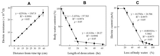 (A) The relationship between electrical resistance and the distance from the apical tip to the designated point of a kudzu vine. (B) The relationship between the duration of desiccation and the loss of body water in kudzu vines by the loss-on-drying (LOD) method. (C) Change in the electrical conductivity of vine samples with different degrees of water loss. Resistance was measured with a point-to-point resistance measurement. Twenty vines were used for each distance including each duration of desiccation, and each degree of water loss. The means and standard deviations were calculated from five replicates of the experiments. Vertical line on each dot represents standard deviation. Two regression lines are shown in each figure.