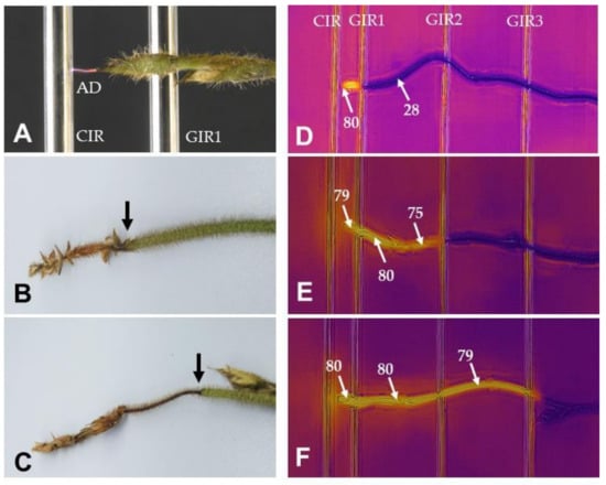 (A) Exposure of a kudzu vine, which was contacted with a ground iron rod (GIR1), to a pulsed arc discharge (AD) from a negatively charged ion rod (CIR). (B,C) Arc discharge-exposed vines showing the dryness of the electrified region (five days after the arc discharge exposure treatment). The arrows in B and C show the points of the vines that came into contact with the second and third grounded iron rods (GIR2 and GIR3), respectively. (D–F) Thermographic demonstration of the increase in temperature in a kudzu vine exposed to a pulsed arc discharge at −10 kV. In (D–F), GIR1, 2 and 3 were linked to a grounded line, respectively. Subfigures (D–F) represent temperature (°C) measured with a spot temperature meter of a camera. The arrow was the site of a temperature measurement. The interval between CIR and vine apex was fixed at 5 mm.