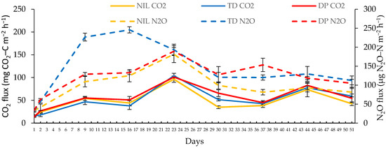 where: ΔC/Δt is the rate of change in N2O–N or CO2–C concentration inside the chamber, A is the surface area of the chamber, Vc is the total volume of the chamber corrected by temperature, Mmol is molar mass of N2O–N or CO2–C, and Vmol is the molar volume of N2O–N or CO2–C inside the chamber, corrected by air temperature using the ideal gas law. N2O–N and CO2–C emissions from soil were expressed in μg N2O–N m−2 h−1 and mg CO2–C m−2 h−1, respectively. Cumulative emissions of N2O–N and CO2–C (i.e., mg N2O–N m−2 and g CO2–C m−2) were calculated by linear interpolation between two close sampling dates and the numerical integration of the function over time, assuming that fluxes changed linearly among sampling days [27]. The correction for background cumulative N2O–N emissions from nitrogen fertilized treatments were calculated as the difference between the cumulative emissions from the TD or DP and NIL treatments: i.e., cumulative N2O–N emissions from TD—cumulative N2O–N emissions from NIL, and cumulative N2O–N emissions from DP – cumulative N2O–N emissions from NIL.