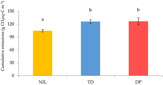 Cumulative greenhouse gas emissions expressed as the CO2–C equivalent (g CO2eq–C m−2) from non-treated soil (NIL) and soils fertilized with ammonium nitrate; top dressing (TD) and deep placement (DP). Different letters (a,b) indicate significant differences (p < 0.05).