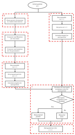 where and are the state and parameters obtained by crossover and mutation, and is the proposal state. The combination of the proposal state with the corresponding parameters form the proposal particle (Figure 1D).