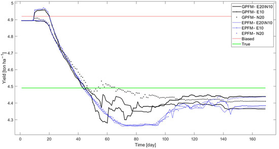 A final analysis investigated the impact of the measurement noise on the parameter estimations. The ensemble size used in this case study was 1000. Lower measurement noise is equivalent to greater confidence in the measurements, which leads to high likelihoods of the particles, which are close to the measurements (Equation (13)), high weights, high acceptance ratio (Equation (15)), and ultimately stronger adjustments of the parameters and/or states towards the true values. The results shown in Table 6 show that this was indeed the case for GPFM, which showed overall good estimations in low measurement noise. On the other hand, the results obtained with EPFM were only marginally affected by the amplitude of the measurement noise. As with ensemble size, an additional test was conducted under low parameter adjustment relative to the state adjustment. In this case, GPFM estimations remained satisfactory, while EPFM failed to achieve good results (Table 6, bottom rows). It worth mentioning that in this test, CCx became the parameter most significantly improved. This agrees with the results presented above and strengthens the observation that CCx has to be adjusted moderately due to its high influence on the canopy cover.