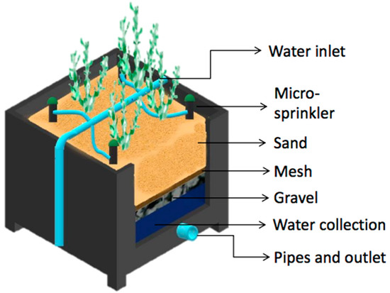 The experimental unit consisted of three RASs separated from each other, each composed of three drainage lysimeters (replicates). Each lysimeter was housed in a polyethylene container measuring 0.5 × 0.6 × 0.6 m (length × width × depth) with a surface area of 0.3 m2 and a total area per RAS of 0.9 . In each lysimeter, four S. neei plants were planted until reaching a biomass of approximately 1 kg per lysimeter or 3 . A leachate collection system was installed in each lysimeter, consisting of a perforated pipe at the bottom to collect the water, followed by a layer of gravel with a diameter of 0.5 cm and height of 15 cm, and polyethylene mesh with 0.3 mm pore size to cover the gravel. For the substrate, coarse sand was used to provide a depth of 35 cm (Figure 1). Each RAS was connected to a nutrient storage, which in turn was fed by a main tank that contained filtered seawater. Each nutrient storage tank was equipped with an aeration pump to promote biological nitrification processes. The irrigation water supply (influent) was performed with a 0.5 HP centrifugal pump (Humboldt, TPM60). Each RAS was supplied daily with 30 of water using a drip irrigation system, programmed to run for 15 min at 09:00 and at 17:00 h. This guaranteed that a large proportion of the irrigation water will penetrated and was able to be collected at the bottom of the lysimeter. Drainage water (effluent) was returned to the respective collection tanks of each system to close the recirculating water loop.