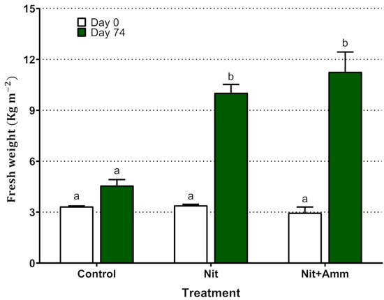 Biomass was compared using a two-way ANOVA in R Statistical Software [33], with interaction between nitrogen simulated concentrations (3 levels: Nit + Amm, Nit, and Control) and days of culture (two levels: 0 and 74 days) (Supplementary Table S1). To compare group means we performed post hoc Tukey tests (Supplementary Table S2) in R Statistical Software [33]. The change in nitrate-nitrogen (NO3−N) concentration showed a negative nonlinear relationship over time, therefore the linear removal rate (RR) was calculated separately for days 1 to 4 and days 5 to 8 of each input, when linearity was observed. Linear regression models with a respondent (dependent) variable of nitrate-nitrogen (NO3−N) concentration and predictor variables of days of culture and nitrogen simulated concentrations were performed using the “lm” function in R Statistical Software [33]. Probabilities of p < 0.05 were considered significant.
