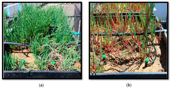 Picture of two lysimeters with Salicornia neei at the end of the experiment (day 74). Picture (a) plants irrigated with nitrate and ammonium (Nit + Amm). Picture (b) plants irrigated with sea-water (Control).