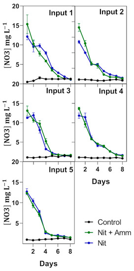 Nitrogen removal by treatment and input. Nitrate-nitrogen (NO3−N) concentration in each treatment is expressed in mg L−1 and measured during an 8 day period from nutrient input over 74 days of experimentation. Treatments were irrigated with nitrate-N and ammonium-N (Nit + Amm), nitrate-N (Nit), or with sea water only (Control group). Each input corresponds to a new irrigation with nitrate-N and ammonium-N (Nit + Amm) or nitrate-N (Nit). Mean values of three lysimeters per treatment are displayed (±SE).