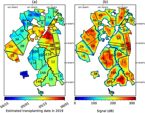 - E: The upper limit of the BSC at the time of transplantation had an effect of approximately 0.2 days on STD. In principle, the smaller the upper limit value is, the smaller the STD becomes. However, if the upper limit value is significantly small, a signal below the upper limit value may not be found at the time of transplantation and the transplanting date may not be identified. Therefore, an intermediate value of vth = −13 dB is adopted in this study. For setting no. 11 with vth = −15 dB, there were two fields for which the transplanting dates could not be identified. Here, just one upper limit is set; however, it is also possible to set two upper limits and apply the second upper limit (vth = −13 dB) to the fields where the transplanting dates cannot be identified by the first upper limit (vth = −15 dB).