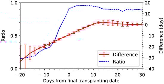 - F: By averaging the BSC around the transplanting date, there was a weak improvement effect of approximately 0.01 days on the STD. There was almost no difference in the STD when comparing the cases where the average period was ±10 days and ±20 days; however, ±20 days was adopted as the average period because a longer period makes it easier to determine the latest transplanting date when performing preliminary estimation.