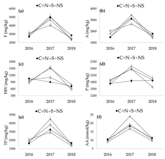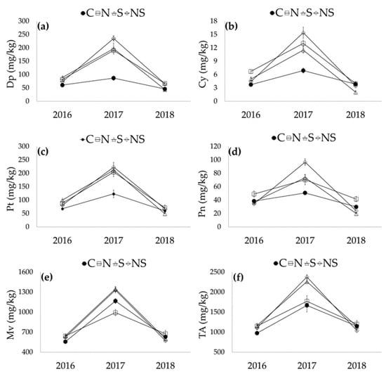The season exerted a strong effect on content; in 2017, it was about double that in 2016 and 2018 due to the climatic conditions, characterized by the greatest temperature excursion and less rainfall. The content found in 2017 season was close to those reported in Aglianico vines grown in the countryside of Minervino Murge in 2007 and 2008 []. The impact on composition was less relevant than that on concentration. It is worth highlighting that the anthocyanin proportions in the three years under study were similar to those reported in literature for the same variety grown in nearby areas of the Apulia region in different years [,,]. In this study, 2017 grapes were characterized by the highest percentages of non-acylated anthocyanins (82.5%) and the lowest of acylated forms (5.3 and 14.5% for acetylated and coumaroylated, respectively). In 2016 and 2018, the grapes had similar anthocyanin content but different proportion of anthocyanin compounds; in 2018 non-acetylated forms were lower (67.9 vs. 74.8%) and coumaroylated forms (23.7 vs. 17.0%) were more represented. Leaf removal increased the content of anthocyanins (+6% for north and +20% for south and north–south, respectively), but poorly influenced the composition. In fact, the percentages of non-acylated forms were 75.1, 76.3 and 77.6% (S, NS and N, respectively) versus 77.3% in control vines; acetylated forms were 5.5 (NS) and 5.9% (N and S) versus 5.6% in control; coumaroylated forms were 17.0, 17.8 and 19.5% (NS, N and S, respectively) versus 20% in control. On the whole, the concentration of total anthocyanins increased in the defoliated vines, confirming that the synthesis of these compounds, which has a genetic basis, is significantly affected by leaf removal. In addition, leaf removal also exerted some effect on the anthocyanin profile, due to changes in the exposition of berries to the temperature, UV, and sunlight, which altered the partitioning between the various forms of anthocyanins []. In particular, all free anthocyanins increased in all leaf removal treatments except for malvidin-3-glucoside, which decreased for north canopy side leaf removal. As to the S*LR interactions, significant differences were found for all anthocyanins, except for Pt-Cm. Figure 3 shows the S*LR interactions of non-acylated and total anthocyanins.
