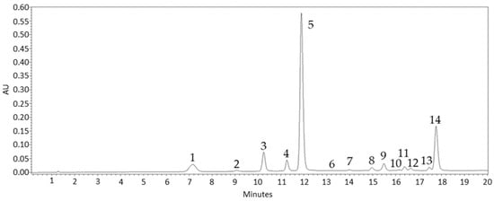 HPLC-photodiode array detector (DAD) chromatogram of skin extract of Aglianico grapes recorded at 520 nm. (1) Dp, delphinidin-3-glucoside; (2) Cy, cyanidin-3-glucoside; (3) Pt, petunidin-3-glucoside; (4) Pn, peonidin-3-glucoside; (5) Mv, malvidin-3-glucoside; (6) Dp-Ac, delphinidin-3-acetyl-glucoside; (7) Pt-Ac, petunidin-3-acetyl-glucoside; (8) Pn-Ac, peonidin-3-acetyl-glucoside; (9) Mv-Ac, malvidin-3-acetyl-glucoside; (10) c-Mv-Cm, cis-malvidin-3-coumaryl-glucoside; (11) Mv-Cf, malvidin-3-caffeoyl-glucoside; (12) Pt-Cm, petunidin-3-coumaroyl-glucoside; (13) Pt-Cm, petunidin-3-coumaroyl-glucoside; (14) t-Mv-Cm, trans-malvidin-3-coumaroyl-glucoside.
