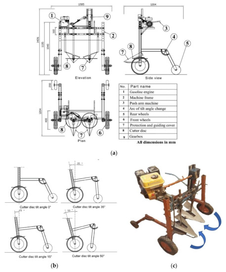 The prototype of the cabbage harvesting machine consisted of five main parts including mainframe, cutter unit, gearbox, engine, power transmission and draw to adjust the tilt angle of the cutter disc, as shown in Figure 1a–c.