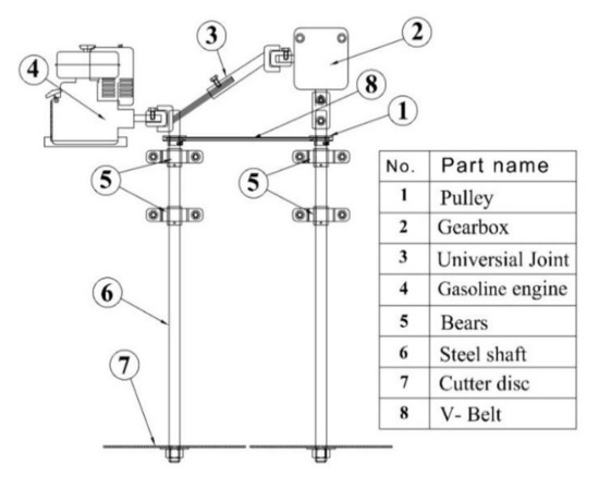 The power produced by the gasoline engine was transmitted to a gearbox shaft by a universal joint and another shaft of gearbox connected to a steel shaft, to transfer the motion between the two steel shafts by pulleys. The pulley was fixed on the first steel shaft with a diameter of 50 mm and the second pulley was fixed on the second steel shaft of the cutter unit with a diameter of 50 mm and using one V-belt (Figure 2). Both cutter discs were fixed at the end of the shafts.