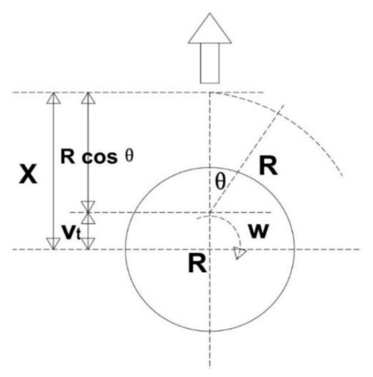 where θ is angle; N is rotating speed; R is the disc radius; X is the instantaneous displacement; Ẋ is motion velocity; Ẍ is the acceleration of motion; V is the forward speed of the cabbage harvester; and ω is angular velocity = 2πN; t = Time.