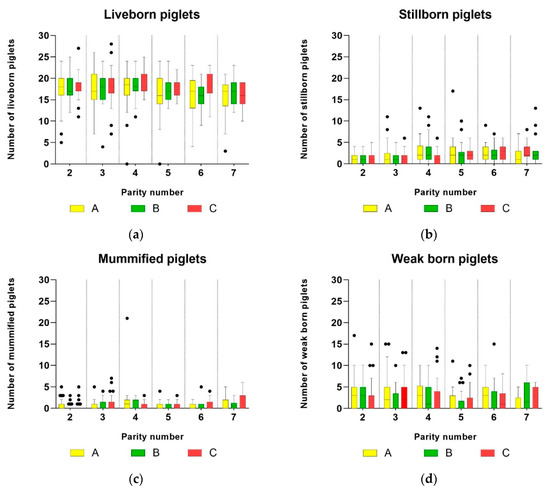 Comparison of number of liveborn piglets (a), stillborn piglets (b), mummified piglets (c) and weak-born piglets (d) in sows of different parity from three tested groups: A (sows vaccination 1 day after weaning), B (unvaccinated) and C (sows vaccination 28 days after weaning). The box-and-whiskers plot was constructed based on Tukey’s method. The horizontal lines show median values.