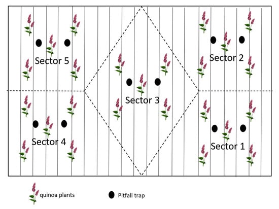 At each location, the field was divided into 5 sectors (considering the slope of the field and the irrigation blocks); in each sector, 5 quinoa plants, at least 20 m apart, were sampled (Figure 1). Each sampled plant was cut at its base and placed into a container with water, alcohol and some drops of liquid detergent. After taking five plants per sector, they were carefully chopped into small pieces, and the whole sample (including the liquid content) was transferred to a labelled, airtight container to be transported to the laboratory for further processing. Plants from borders were always avoided for sampling. During collection, care was taken to minimize the disturbance of any insects present on the plant.