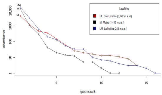 Rank–abundance curves of phytophagous insects were built as a function of their abundance in the samplings at each field site (Figure 2). Comparatively, the curve for the San Lorenzo field site (SL) has a less pronounced slope than the curves for the other sites. This suggests that the phytophagous species are more evenly distributed at this locality or there was a lower dominance of the most abundant pests as compared to at the La Molina and Majes field sites, which were characterized by a higher dominance of certain taxa.