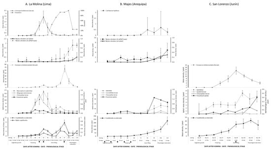 Seasonal incidence of the main insect pests (mean number per plant or pitfall trap ± SD) and their associated natural enemies (mean number per plant or percent parasitism) sampled on quinoa at the field sites in (A) La Molina, Lima (from 22 September 2015 to 29 December 2015); (B) Majes, Arequipa (from 15 May 2016 to 12 September 2016); and (C) San Lorenzo, Junín (from 31 January 2016 to 12 May 2016). Arrows on the time axis indicate the timing of the insecticide applications.