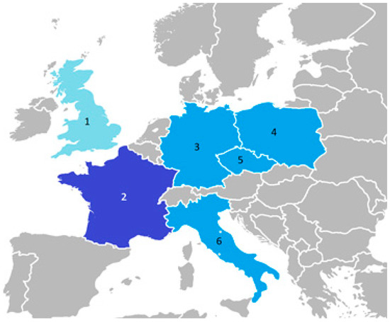 Countries for which original research works on Carabidae beetle fauna on poplar and willow plants were available in searched databases (1—Great Britain, 2—France, 3—Germany, 4—Poland, 5—Czech Republic, 6—Italy; light blue—works used in the study; blue—works used as well not used in the study; dark blue—works not used in the study).