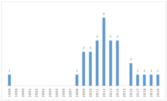 The articles collected were sorted according to the year of publication and the country of origin (the country was assigned based on the corresponding author). The results are presented in Figure 2 and Figure 3. In the years 1998–2020, 32 articles on Carabidae biodiversity in energy willow and poplar plantations were published. Most of them, as many as 15 items, were published by German authors. Their number is three times higher than that of Polish and British publications. For Czech and Swedish authors, a database search showed two publications each. One publication was found for the Netherlands, Slovakia, and Belgium, respectively. In investigations for years from the 1950s until 1998, the databases did not show any publications described by the keywords used. In 1998, one publication was issued, and another was issued after 9 years, in 2008. An upward trend was observed for the following years, with 6 publications issued in 2012. For 2013 and 2014, there were 4 publications each. After this year, there is a clear decrease in the number of publications—in 2015, no publications were issued, in 2016, two were issued, and in the following years, only one publication per year was issued.
