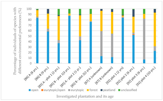 Based on the data analysis, presented in Figure 4, the predominance of Carabidae species preferring the environment of open areas was found. The comparison of Figure 5 and Table 2 showed that the percentage share of species preferring open areas is independent of the age of the plantation, while its dependence on the age of the stand seems impossible to assess due to insufficient data. However, their share appears to decline as the age of the canopy increases. Species preferring open areas also constituted the most numerous group in terms of the number of individuals in a given population, which is presented in Figure 5. This tendency occurred on most plantations, both willow [85,86,87] and poplar [92]. Species with unknown habitat preference constituted less than 15% of all recorded species. On three plantations, the niche of open ground species was occupied by eurytypical species. The share of forest species was greater, at over 18 percent (Figure 4). The number of forest species depending on the age of the plantation and the age of the canopy is presented in Table 2. In some plantations, there was a visible predominance of ground beetles representing forest species, which, however, was not correlated with the age of the plantation. Unfortunately, the amount of data allowing us to assess the influence of the surrounding environment on the number of Carabidae from different ecological groups was insufficient. A similar correlation concerning the age of the stand is impossible to analyze due to the lack of sufficient data, as the analyzed publications lack information enabling its determination. The number of peatland species was less than 10% that of all species collected, and the number of individuals with this preference was even lower.
