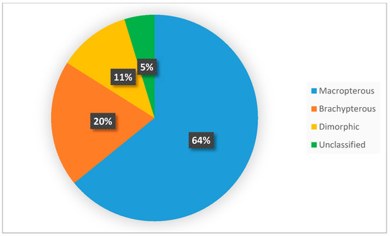 Percentage distribution of Carabidae species with different dispersibility. This diagram was made based on selected publications, including data on the ecological characteristics of Carabidae communities inhabiting the investigated plants.