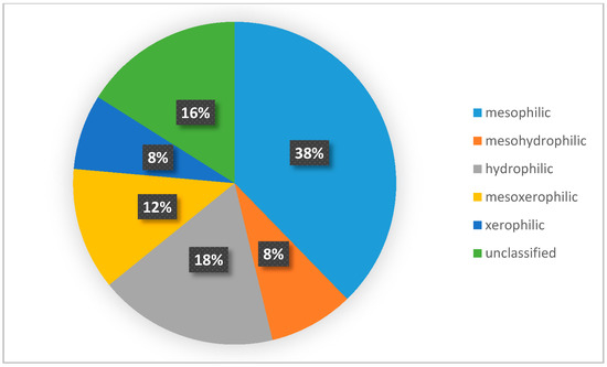 Per cent of Carabidae species with a different hygropreference. Diagram was made based on selected publications, including data about the ecological characteristic of Carabidae communities inhabiting the investigated plants.