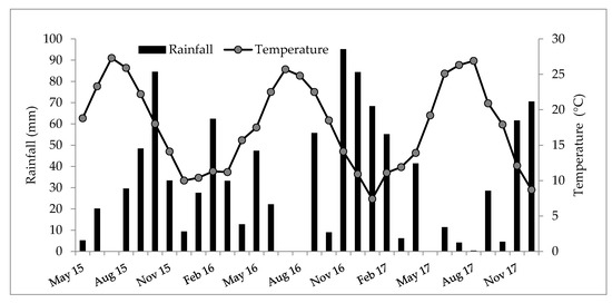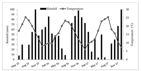 Monthly rainfall and mean temperature at the southern Sardinia site during the study period.