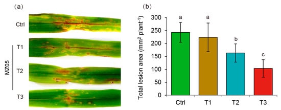 To investigate whether P. fluorescens MZ05 enhanced the resistance of maize plants against S. turcica, susceptible maize plants grown on soil were inoculated with MZ05 and subsequently subjected to pathogen infection. In this study, maize seedlings were firstly grown on soil for 4 weeks. Then, the soil was inoculated with or without the suspensions of P. fluorescens MZ05 at the final density of 1 × 106, 1 × 107, and 1 × 108 CFU g−1, respectively. After 7 days of inoculation, a spore suspension of S. turcica at 5 × 104 conidia mL−1 was sprayed on the leaves of both the non-inoculated (control) and inoculated plants. As shown in Figure 1a, the fourth leaves of control plants exhibited large spindle-shaped lesions surrounded by necrotic tissues at 5 days post infection (dpi), whereas the inoculation with P. fluorescens MZ05 at 1 × 106 CFU/g soil did not reduce the necrotic spots on the leaves. In contrast, plants inoculated with P. fluorescens MZ05 at 1 × 107 or 1 × 108 CFU/g soil displayed a marked reduction in the total lesion area, producing disease-resistant phenotypes (Figure 1b). Therefore, these results indicated that the higher inoculum dosage of P. fluorescens MZ05 could markedly enhance the resistance of maize plants to S. turcica.