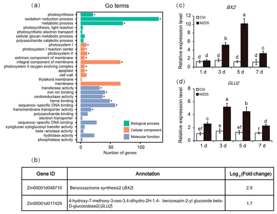 RNA-sequencing analyses of P. fluorescens MZ05-inoculated plants. Four-week-old maize seedlings were treated with or without bacterial suspensions of MZ05 (1 × 108 CFU/g soil) for 7 days. Then, the fourth leaves were collected to extract total RNA for RNA-sequencing. (a) List of gene ontology (GO) terms for differentially expressed genes (DEGs) based on GO classifications. All of the DEGs were categorized into three groups: Biological process, cellular component, and molecular function. The asterisks indicate the significance of the comparison between the control (Ctrl) and MZ05-inoculated plants. (b) Transcription profiles of two BX biosynthetic genes BX2 and GLU2 in the inoculated plants compared with the controls. Moreover, qPCR analyses of the expression of BX2 (c) and GLU2 (d) in maize plants exposed to different inoculation times of MZ05. Different letters indicate statistically significant differences between the control and inoculated plants using one-way analysis of variance and Ducan’s tests (p < 0.05).
