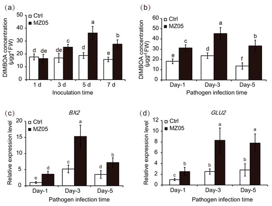Analyses of the DIMBOA levels and the expression of BX biosynthetic genes in the leaves of maize plants. Four-week-old maize seedlings were treated with or without bacterial suspensions of MZ05 (1 × 108 CFU/g soil). The fourth leaves harvested from different inoculation times were then used to measure the levels of DIMBOA (a). After 7 days of inoculation, these plants were subjected to the infection of S. turcica at 5 × 104 conidia mL−1. At the indicated time points of pathogen infection, leaf samples were harvested to measure the content of DIMBOA (b). Meanwhile, the expression levels of BX2 (c) and GLU2 (d) were also quantified in the pathogen-infected leaves. Different letters indicate statistically significant differences between the control (Ctrl) and inoculated (MZ05) plants using one-way analysis of variance and Ducan’s tests (p < 0.05).