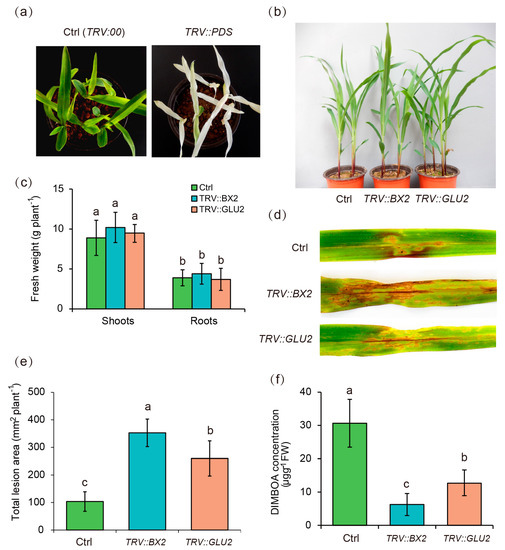Virus-mediated silencing of BX2 and GLU2 attenuated the P. fluorescens MZ05-induced disease resistance in maize plants. (a) The phenotype of maize plants infected with TRV::00 (Ctrl) or TRV::PDS at two weeks. (b) Maize plants were initially infected with TRV::00 (Ctrl), TRV::BX2, or TRV::GLU2 for four weeks, and (c) shoot and root fresh weights were measured in these plants. Subsequently, these plants were inoculated with P. fluorescens MZ05 (1 × 108 CFU/g soil) for 7 days. After that, the inoculated plants were sprayed with a spore suspension of S. turcica at 5 × 104 conidia mL−1 for 5 days. Then, these plants were used to analyze disease symptoms (d), total lesion area (e), and DIMBOA content (f). Different letters indicate statistically significant differences between the non-inoculated and inoculated plants as analyzed by Ducan’s tests (p < 0.05).