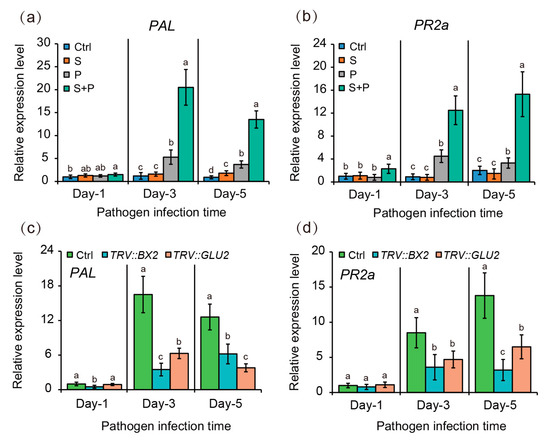 We further examined the transcription of two defense-related marker genes, including both the phenylalanine ammonia-lyase (PAL) and β-1,3-glucanase (PR2a) genes, in the leaves of maize plants exposed to MZ05 (S) and/or S. turcica (P). The expression of PAL and PR2a was remarkably higher in response to dual inoculation (S + P) than those in the non-inoculated (control) plants (Figure 5a,b). By contrast, the inoculation of MZ05 or S. turcica alone slightly upregulated the transcription of PAL and PR2a compared with the control plants (Figure 5a,b). However, virus-mediated silencing of BX2 or GLU2 attenuated the MZ05-induced effects observed in pathogen-infected plants, as evidenced by lower transcription of PAL and PR2a (Figure 5c,d). Hence, our data indicated that the inoculation with MZ05 increased leaf DIMBOA levels and further effectively induced host defense responses, thereby hampering the pathogen infection.